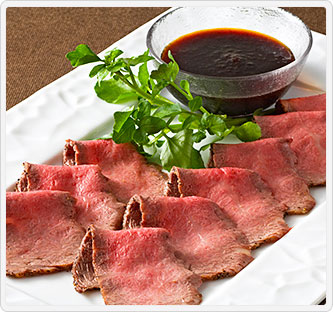 日本を代表する和牛である神戸ビーフを使用し、〔神戸のじぎく家〕の想いと生産者の食材への想いをお客さまにお届けできるようおいしい料理を丹精込めてつくっております。神戸牛の旨みを閉じ込めたローストビーフを、お好みの厚さにカットしてお召しあがりください。