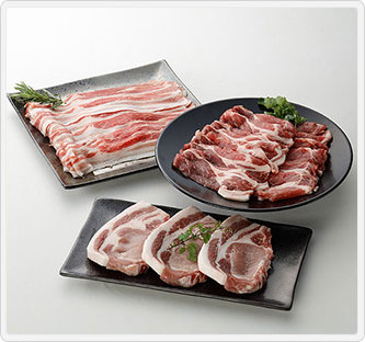 内容量:ロース(とんかつ用・ソテー用)450g(3枚入)、肩ロース(生姜焼用)500g、バラ(しゃぶしゃぶ用)500g