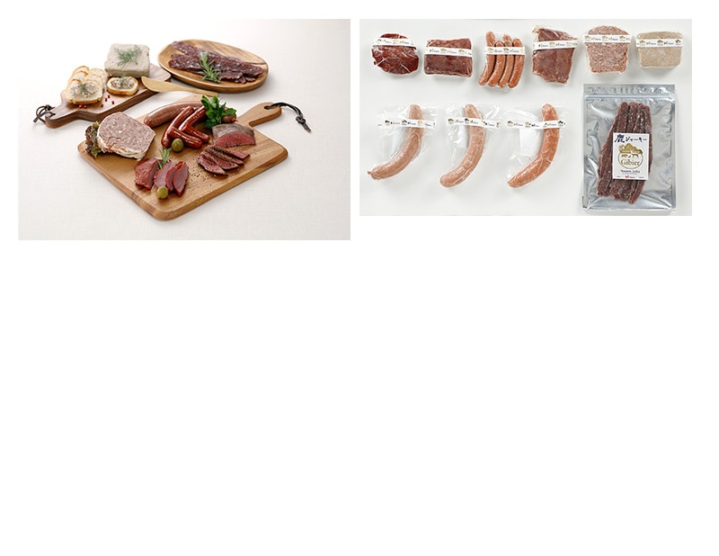 内容量:鹿の粗挽きフランク100g×3、鹿ステーキ100g×2、鹿のレバーペースト・鹿のパテドカンパーニュ・鹿のエマルジョンソーセージ各100g、鹿のソフトジャーキー60g、鹿のボンレスハム80g