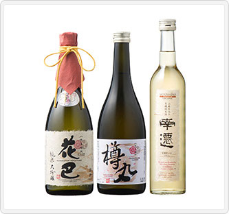 内容量:花巴万葉の華 純米大吟醸 限定中取り720ml、樽丸 純米樽酒720ml、南遷 プレミアムオーガニック500ml