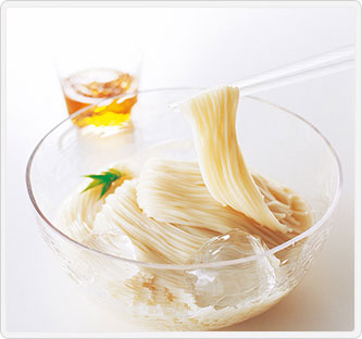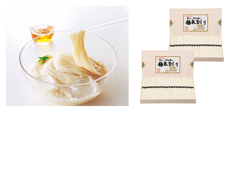 小豆島に420年以上前より伝わる手延べ製法によって丹念に作られたそうめんです。本品は麺の仕上がりがよいとされる極寒期(12月の冬至から2月末まで)の期間限定製造品です。製麺技能士の技を随所に感じられる品です。