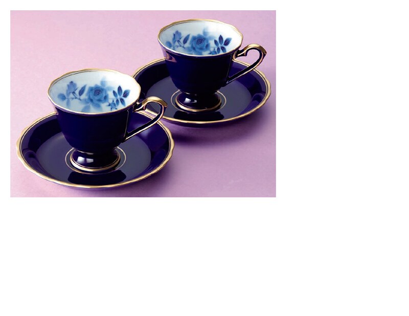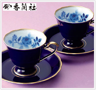 香蘭社を代表する「瑠璃」は、“ロイヤルブルー”といわれる独特の色付けをし、白磁の内側に「幸福の青い薔薇」と呼ばれる青い薔薇が描かれ、金彩の縁取りがさらに気品を添えています。