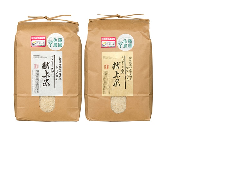 おかずを引き立てるさっぱりとした味わいのササニシキと、粘りの強さと飽きのこない甘みがありやさしい味わいのひとめぼれをセットにしました。どちらも宮城県東松島市にある〔佐藤農園〕で育てたお米です。食べ比べて味の違いをお楽しみください。