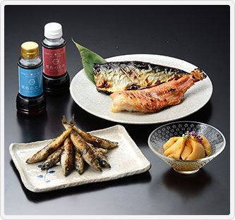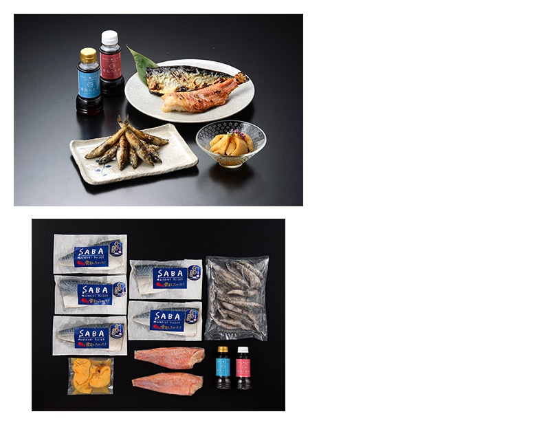 内容量:金華サバフィレ(骨取り)5枚、キンキセンターカットフィレ2枚、ほや200g、目光500g、焼魚のたれ・煮魚のたれ各200ml
