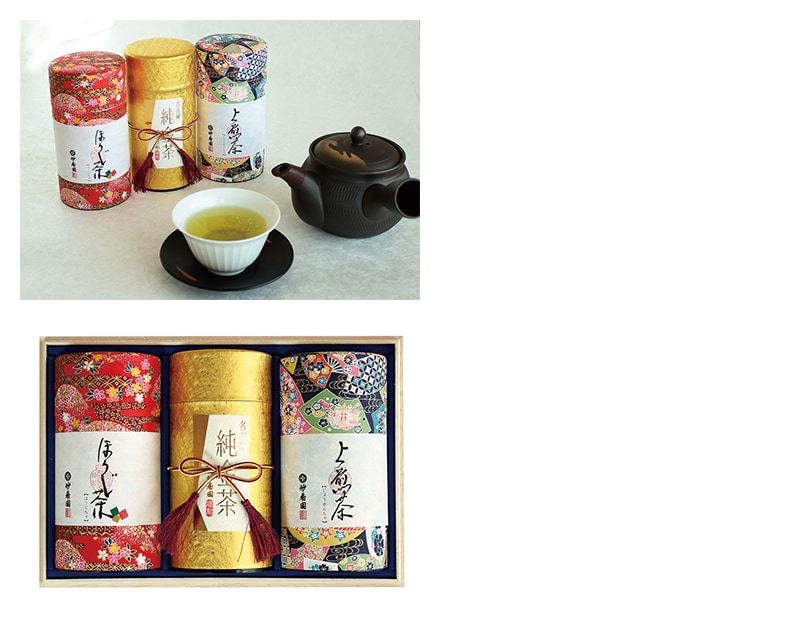 愛知県名古屋市で創業100年余りの老舗茶屋〔妙香園〕の3種のお茶セットです。香味豊かでさっぱりとした飲み口の看板商品のほうじ茶、旨みと渋味が調和した上煎茶、急須から湯呑に注ぐと、深蒸し茶の緑に金箔の浮かぶ名古屋純金茶を詰め合わせました。