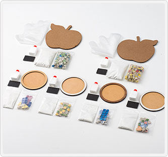 セット内容:鍋敷き素地×2枚、コースター素地×4枚(素地の色アソート・指定不可)、タイル×6袋(最低数量400個・色および数量は一定ではありません・指定不可)、目地材×6袋、木工用ボンド×6個、ポリエチレン手袋×2双、ヘラ×6枚