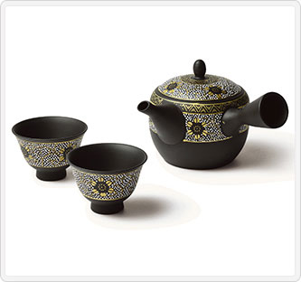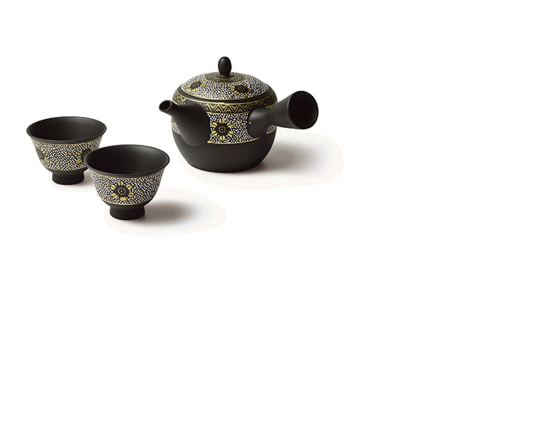急須の産地としられる愛知県常滑市から、伝統工芸士・梅原隆氏が手がける「白盛花紋 茶器揃」を。父・梅原晴隆氏が創立した〔玉光陶園〕を2代目として受け継いで以来、数々の受賞を重ねてきました。絵付けは九谷焼の職人がひとつひとつ白盛という白絵の具を凸状に盛り上げる技法で手書きをしており、常滑焼と九谷焼の技を感じることができます。