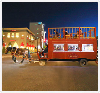 ばんえい十勝で活躍した輓馬ムサシコマが曳く馬車ツアー「馬車BAR」。ソリを曳いた馬たちが力と速さを競う「ばんえい競馬」を世界で唯一持つこの街に、新しくお酒と景色とを楽しめる馬車が走ります。JR帯広駅から徒歩3分の中心市街地にあるHOTEL & CAFE NUPKAを発着地点に、約2キロのコースを50分ほどで巡ります。地元素材のクラフトビールやおつまみをお供に、北の屋台、帯広駅前など賑わい溢れる夜の中心市街地を馬車から眺める非日常体験をどうぞ。ツアー後には馬車を飛び出して先ほど眺めた街中に繰り出し、また違った景色やローカルフードを楽しめます。
