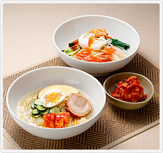 コシのある生麺とコクのあるストレートスープ、冷麺に欠かせない辛み(カクテキ)がセットになった冷麺と、麺に絡めた甘辛の特製タレが食欲をさそうビビン麺をお楽しみいただけます。自慢の本格手造りキムチも一緒にお召しあがりください。