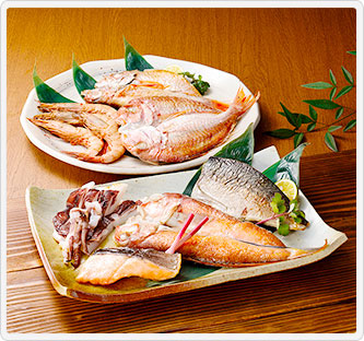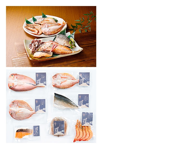 内容量:桜島灰干し(天然鯛・首折れさば(半身)・のどぐろ・甘鯛・いか×各1枚、たかえび5尾、霧島サーモン1切)