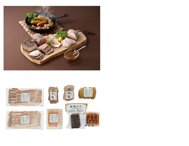 北海道産の豚肉のみを使用し、保存料や発色剤などの食品添加物を使用せずに製造した無塩せきのハム・ベーコンと、羅臼海洋深層水塩のみで味付けし、素材の旨みを引き出したローストビーフ・ローストポークのセットです。