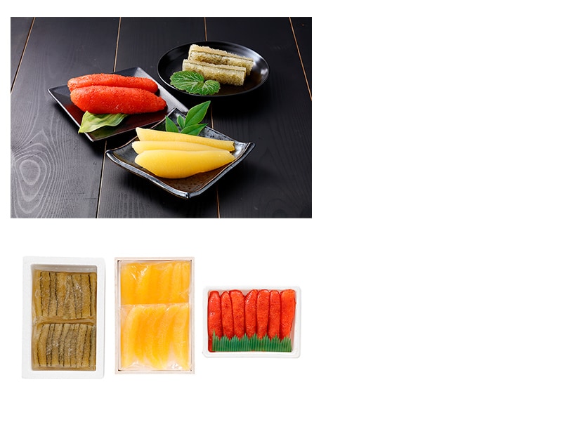 内容量:味付数の子150g×2、辛子めんたいこ500g、味付子持昆布200g×2原産地:にしんの卵=北海道、すけとうだらの卵巣=アメリカまたはロシア、子持昆布=アメリカ加工地:北海道アレルギー:小麦賞味期間:製造日より冷凍で2年保存方法:冷凍