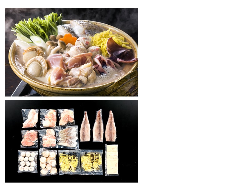 内容量:鶏もも肉100g×5、ツボ抜きいか300g(3尾入)、ボイル帆立180g(9個入)、助宗鱈切身40g×4、たこ入つみれ180g(15g×12)、冷凍生ラーメン80g×2、鶏白湯鍋のたれ50ml×3
