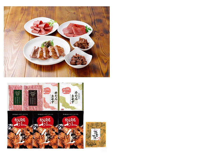 内容量:牛たん真空パック(塩味)95g×3、牛たんおかず(味噌味・塩味)各120g、おつまみ牛たん(ペッパー味・わさび味)各50g、南蛮味噌40g