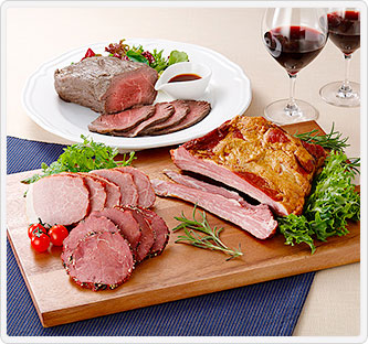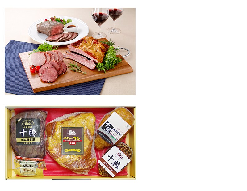 内容量:ローストビーフ500g、乾塩骨付きスペアリブベーコン・十勝ボンレスハム各400g、スパイスビーフ250g、ローストビーフソース20g×3