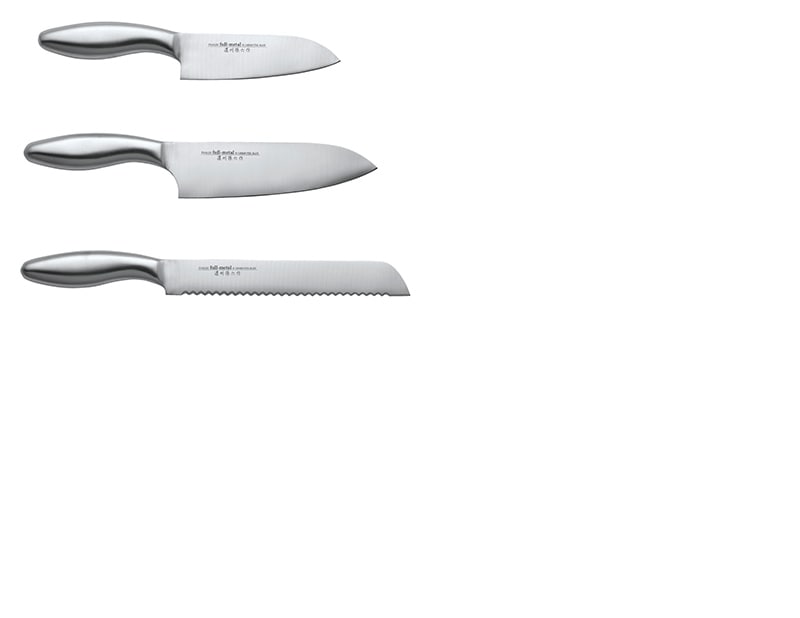 サイズ(約)三徳包丁=全長29・刃渡り17cm、パン切りナイフ=全長31・刃渡り19cm、小三徳包丁=全長26・刃渡り13.5cm 材質:刀身=ステンレス刃物鋼、柄=ステンレス 生産国:三徳包丁、小三徳包丁=日本製、パン切りナイフ=中国製