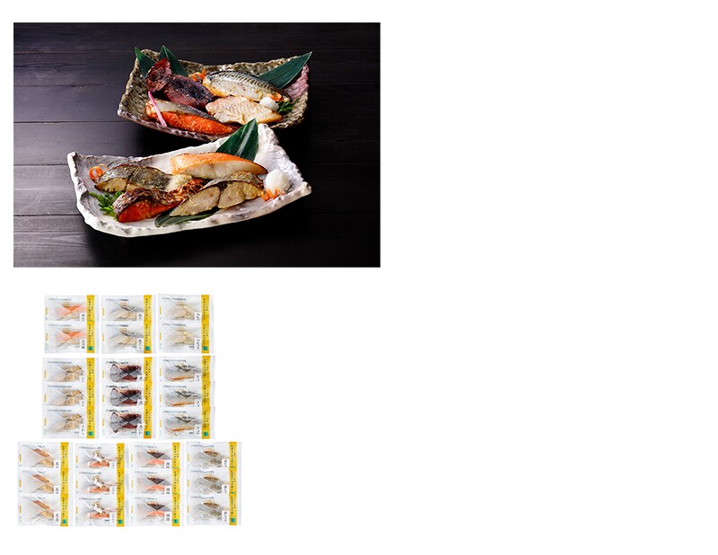 内容量:西京焼き(さわら・真いか・さば・赤魚・トラウトサーモン・銀鮭・銀ヒラス各60g×3、金目鯛・銀だら・白ヒラス各60g×2)