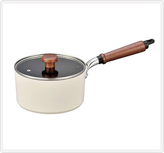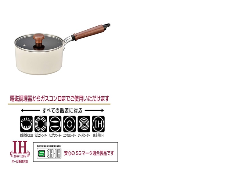 素材:本体-アルミニウム合金、内面-テフロン?プラチナプラス加工、外面-セラミック耐熱塗装(ホワイト)、底面-鉄・アルミニウム溶射はり底(SG認定)、ハンドル・つまみ-天然木、蓋-全面物理強化ガラス