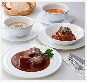 内容量:信州産トマトのミネストローネ160g×4、信州産赤ワインの牛肉赤ワイン煮・信州産りんごのポタージュ各150g×4、信州味噌の和風デミグラスソース豚ばら煮込み125g×4