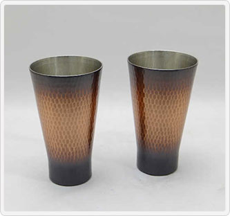 職人の手技によって施された鎚目模様と、色付けで仕上げた純銅製の鎚目タンブラー。銅は熱伝導性に優れ、冷たい飲み物を注ぐと瞬時にカップ全体が冷却され、清涼感を感じながらお楽しみいただけます。