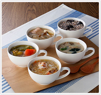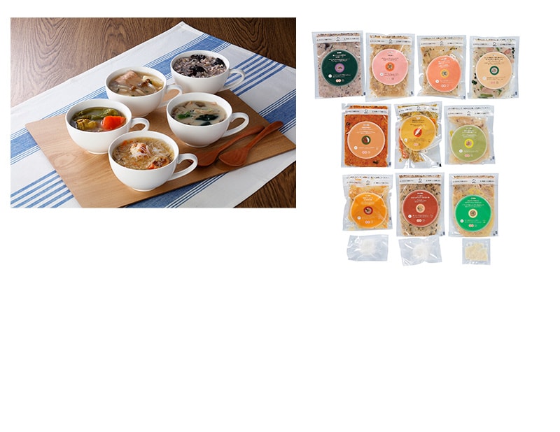内容量:黒きくらげと鶏肉の16穀スープ・魚介のダシを味わうイタリアンズッパのリゾット・鮭とじゃがいもの味噌バタースープ・THE 豚汁・ごま香る、大豆そぼろのさっぱり坦々麺・鶏手羽と根菜のピリリ山椒味噌スープ・豆腐つくね入り台湾酸辣湯麺・美肌を作るチキンと大豆のスープカレー・ほうれん草と3種のキノコのオーツミルクスープ・緑黄色野菜のこくうまキーマカレー各300g