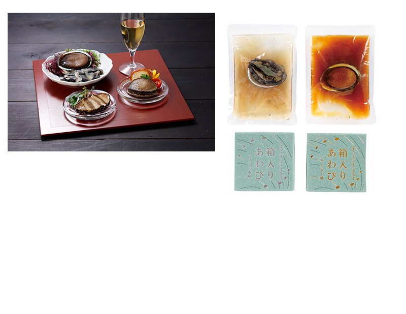 内容量:箱入りあわび(バターソテー風・白ワイン煮味)各75g、あわびの煮貝・あわびの水煮×各1個
