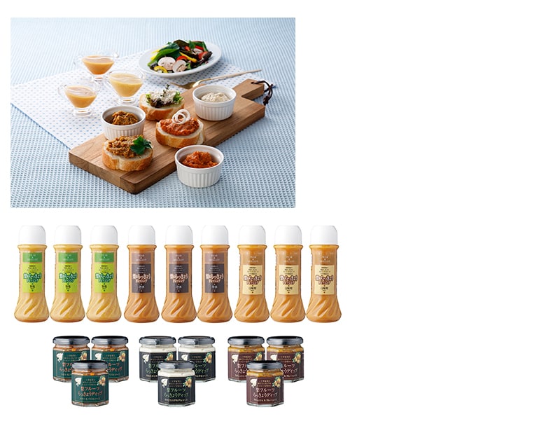 内容量:梨&らっきょうドレッシング(旨塩仕立て)・梨&らっきょうドレッシング(醤油仕立て)・梨&らっきょうドレッシング(白味噌仕立て)各205ml×3、梨フルーツらっきょうディップ(わさび入りタルタルソース)150g×3、梨フルーツらっきょうディップ(トマト&バジルソース)165g×3、梨フルーツらっきょうディップ(ラディッシュ&カレーソース)160g×3