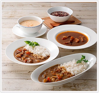 内容量:そのまま食べられるもち麦ごはん330g×3、レトルト大麦カレー(中辛国産豚肉・辛口若狭牛すじ肉)・レトルト大麦ビーフシチュー・レトルト大麦クリームシチュー各200g×2、大麦入りぜんざい180g×4