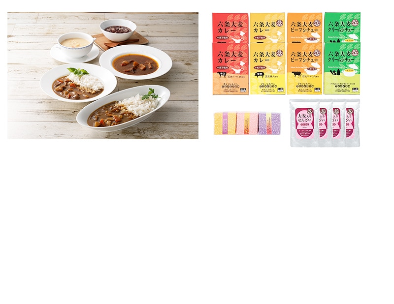 自家製米のコシヒカリにもち麦が入ったもち麦ごはん、ご飯とも相性抜群なレトルトカレー&シチュー、お餅を入れなくても白玉ぜんざいのような食感を楽しめる大麦入りぜんざいのセットです。どの商品にも福井県産が六条大麦が入っています。