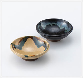 龍門司焼伝統の三彩釉と黒釉の平鉢のセット。深みのある形状に三彩釉、黒釉には青流しの装飾が施してあります。和食にも洋食にも合うデザインで、お料理を引き立てます。