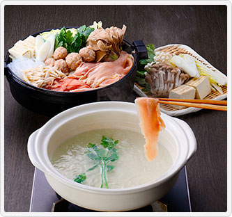 比内地鶏を贅沢に味わう、しゃぶしゃぶとすき焼きのセット。しゃぶしゃぶを楽しんだ後の比内地鶏の出汁がたっぷり染み出たスープが絶品で、シメにおじやや、うどんがオススメ。すき焼きには百有余年の間地元に愛され続けられるしょうゆの蔵元、浅利佐助商店製造の“あきた鶏すきタレ 鶏うまし”を合わせました。