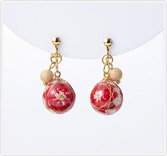 「ビー玉の中に入っているような美しいツヤと愛らしさ」が魅力の手毬「毬玉?」は、ひとつひとつが手作りです。多数の伝統的な図柄の中から、赤い菊で、八枚の花びらを採用しました。