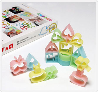 くるっと裏返して、つまんで握っておさえてカタチを見つける、新感覚ひらめきブロック。くるっとひっくり返すと四角形からちょうに大変身。くにゅっとおさえると、イモムシ、ロボットいろいろなカタチにかわります。あっ!と驚くカタチの変化と、ほっぺのようにやわらかくしなやかで弾力のある手ざわり。成長にあわせてさまざまな遊びができ、無数の形をイメージし遊ぶことで、子どもの創造力を促します。