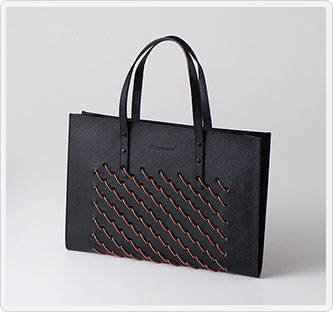 一枚の牛本革にひし形金網を編み込んだ今までにないデザインのバッグ。ビジネスはもちろん、プライベートにもご活用いただけます。編み込む金網の色は4色から選ぶことができます。近畿大学文化デザイン学科と、東大阪に工場を持つひし形金網製造会社の共和鋼業株式会社、同じく東大阪の老舗レザーファクトリー、株式会社ナダヤの共同開発で生まれた産学連携品です。