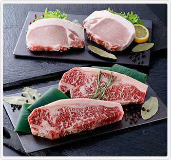 内容量:黒毛和牛熟成サーロインステーキ・金アグーロースステーキ各150g×2