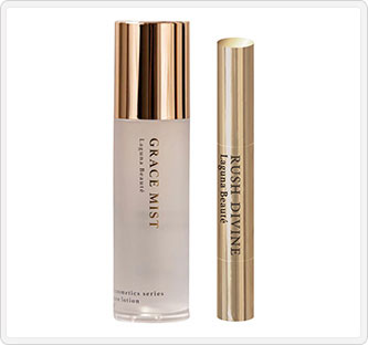 グレイスミストは、保湿しながら艶肌コンディションへと導くためのエッセンスローション。敏感になりがちな肌をなめらかに整え、後からつけるスキンケアの浸透をサポートします。ラッシュディバインはヒト脂肪由来幹細胞順化培養液という成分にこだわったまつ毛美容液。1本1本に存在感を与え、密度とハリ、コシのある艶やかなまつげに導きます。