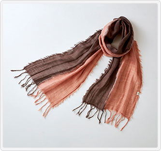 奄美の伝統染色技法「泥染」によって染められたストールです。泥染は、車輪梅で茶褐色に染めた生地に、染め場の泥田で泥をすり込むことにより、黒の深みが増していきます。こちらは車輪梅のほのかな美しい茶褐色を残し、泥染めを合わせ華やかな雰囲気に仕上げました。ストールは、今治の自社工場でエジプト綿という繊維が長く細番手の糸だけを用いて、繊細な肌触りと光沢のある上質な生地に織り上げました。
