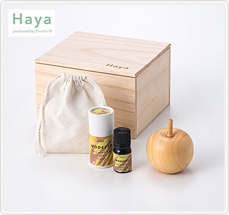 木製のディフューザーと、木曽ヒノキとゆずのブレンドエッセンシャルオイル「Modesty」のギフトセット。りんごのディフューザーは全て木の表情の異なる一点ものです。エッセンシャルオイルは日本の風景を伝えることを大切に、山や森、里山の風景の植物を蒸留抽出し、丹念に香りづくりを行っています。