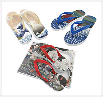 日本らしさを追求した、飾れる浮世絵ビーチサンダル。もちろんクッション性、耐久性など機能にも優れ、全ての製造工程を日本国内で行っています。
