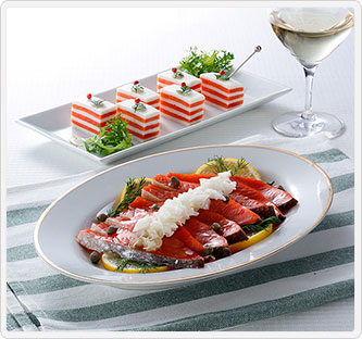 天然紅鮭を桜のチップで丹念に燻した深いあじわいのスモークサーモンと、クリームチーズベースの生地と紅鮭スモークを7層に重ねたミルフィーユをセットでお届けします。