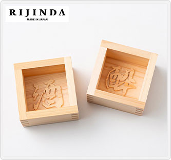 底漢字の「酒」「酔」のペアです。木枡の材料は、奈良県吉野町で育った国産ヒノキです。本商品は酒器として使用した後もインテリアや小物入れとして使っていただけます。技術継承の危機にあるだんじり彫刻を後世に残すため、木彫刻や木の魅力を広める商品を生み出し続け、まただんじりへと回帰できるようにという願いを込め、だんじりを反対から読みRIJINDA(リジンダ)と名付けました。