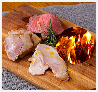 土佐の気候・風土が育んだブランド肉、赤身がうまい和牛「土佐あかうし」、ダバダ火振り栗焼酎の栗残渣を食べたダバダ栗豚、軍鶏とコーチンを組み合わせた旨みたっぷりの土佐はちきん地鶏をこだわりの調味料で味付けし、食品添加物を使わずお肉そのものの自然なおいしさを味わえるとともに、高知独特の藁焼きで炙り燻したあとじっくりと低温加熱した芳醇な香り漂うローストセットです。ロースト用のタレとしても使える高知のオーガニック人参ドレッシングとセットにしました。