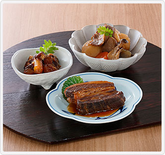 内容量:豚肉なんこつのやわらか煮(柚子胡椒味)・肉じゃが各150g×2、豚バラ肉の角煮100g×2