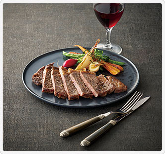 和牛とホルスタインを掛け合わせた〈福田農場〉のオリジナルブランド牛「福姫」のリブロースステーキ。土にもえさにもこだわり、健やかに育った牛肉は、さっぱりした赤身の旨みと、和牛ならではの甘みが両立したおいしさです。
